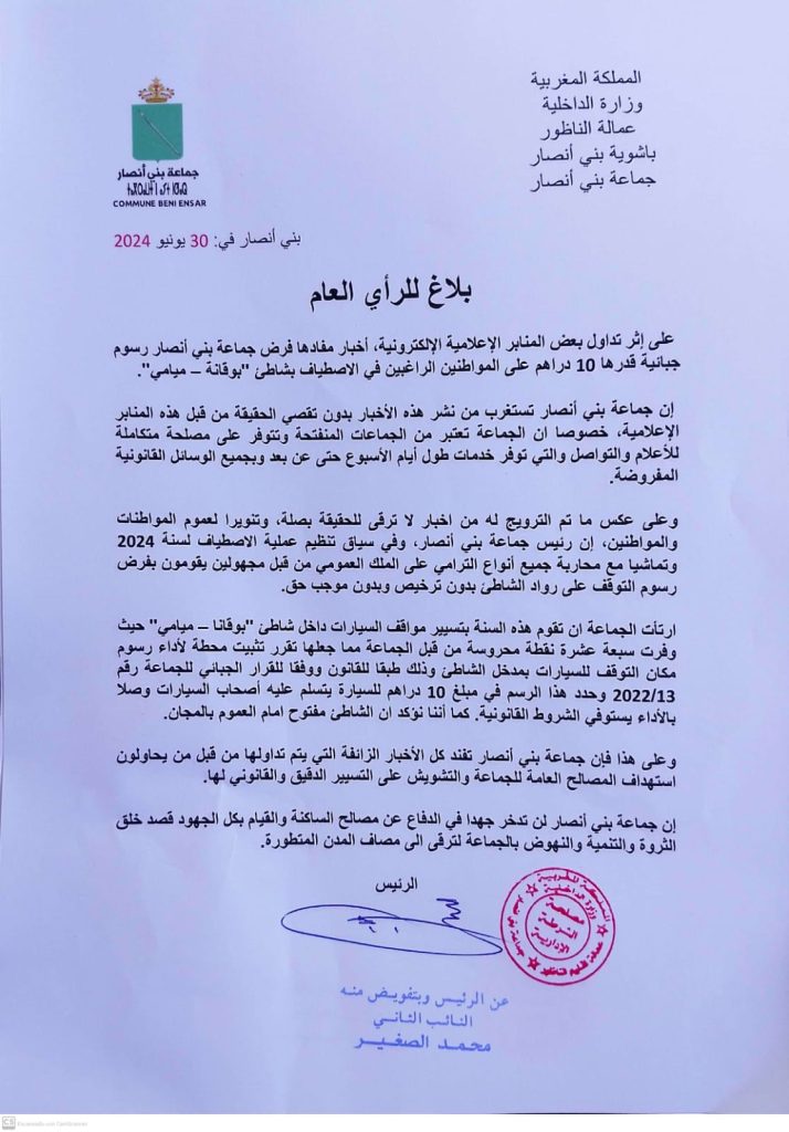 بلاغ توضيحي حول المغالطات المنشورة بخصوص مواقف السيارات بـ بوقانا