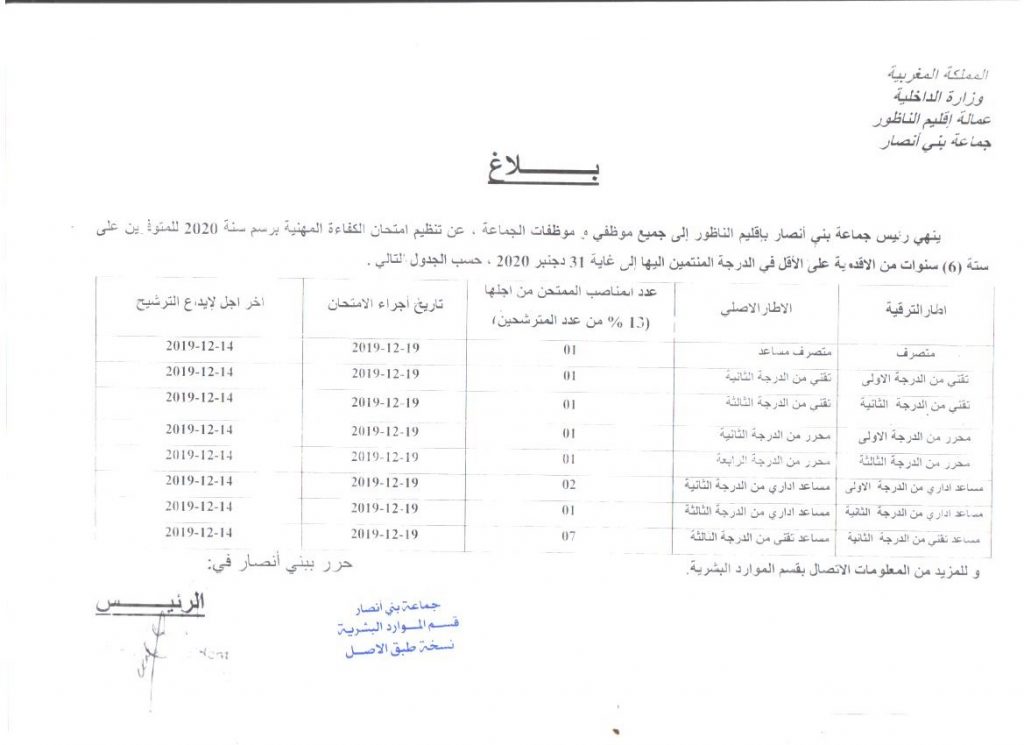 ينهي رئيس جماعة بني انصار إلى علم كافة الموظفين المستوفين لست (06) سنوات من الخدمة الفعلية في الدرجة إلى غاية يوم إجراء الاختبار الكتابي، أنه سيتم إجراء امتاحانات الكفاءة المهنية برسم سنة 2020 يوم السبت 19/12/2020 ابتداء من الساعة التاسعة (09) صباحا.